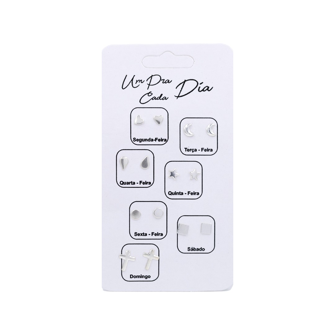 Cartela com 7 pares de brincos em Prata 925. Garantia eterna de todas as peças.