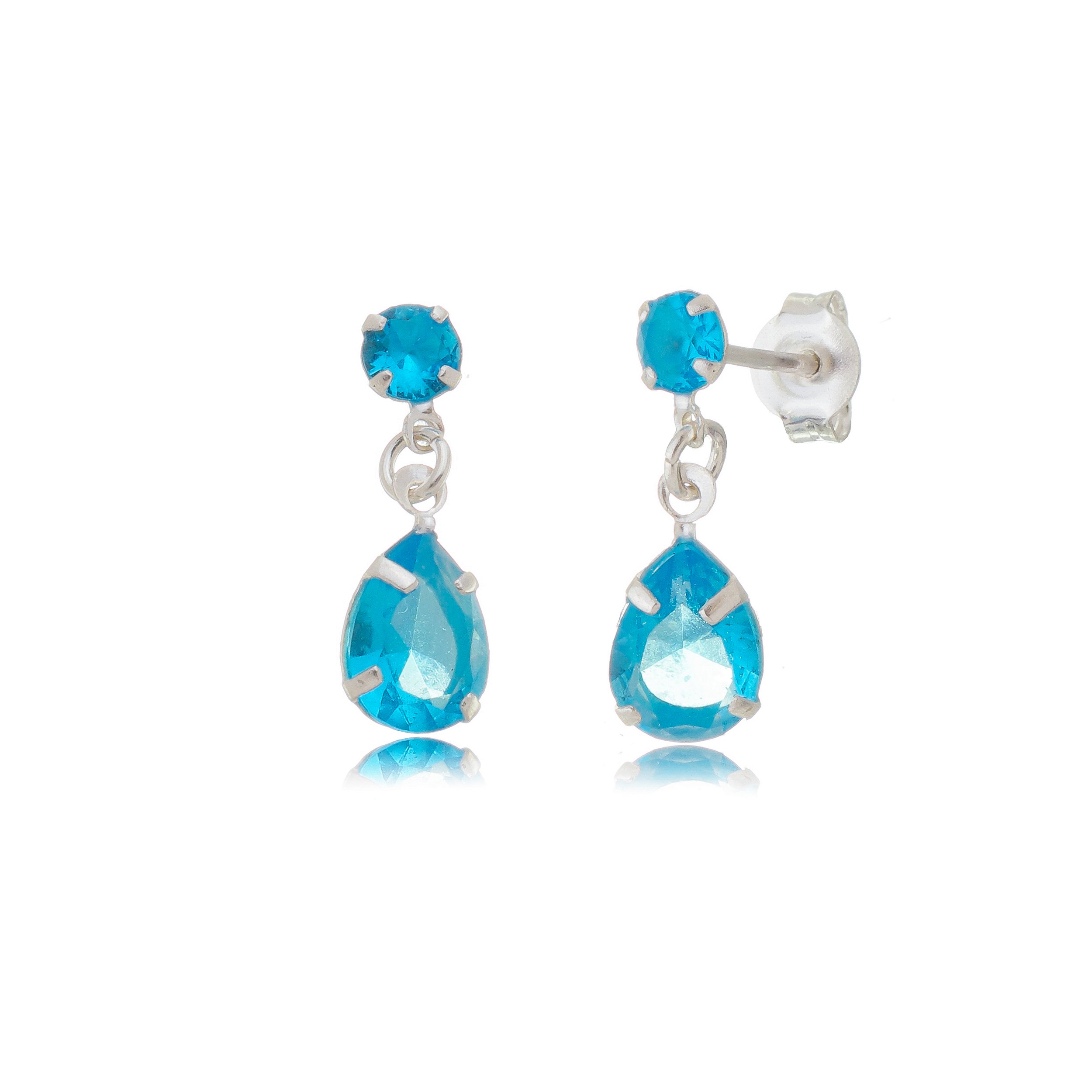 Cartela de brincos zircônia Gota Garra com Redondo 4mm - Azul Céu - Prata 925 (Contém 12 Pares)
