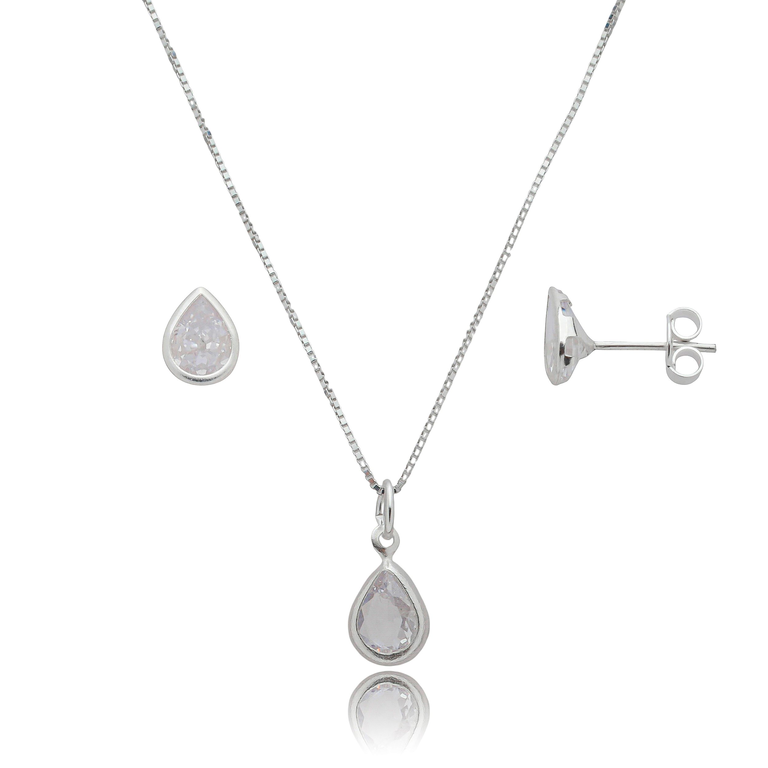 Conjunto Gota Embutido 6x8mm -Cristal- Prata 925