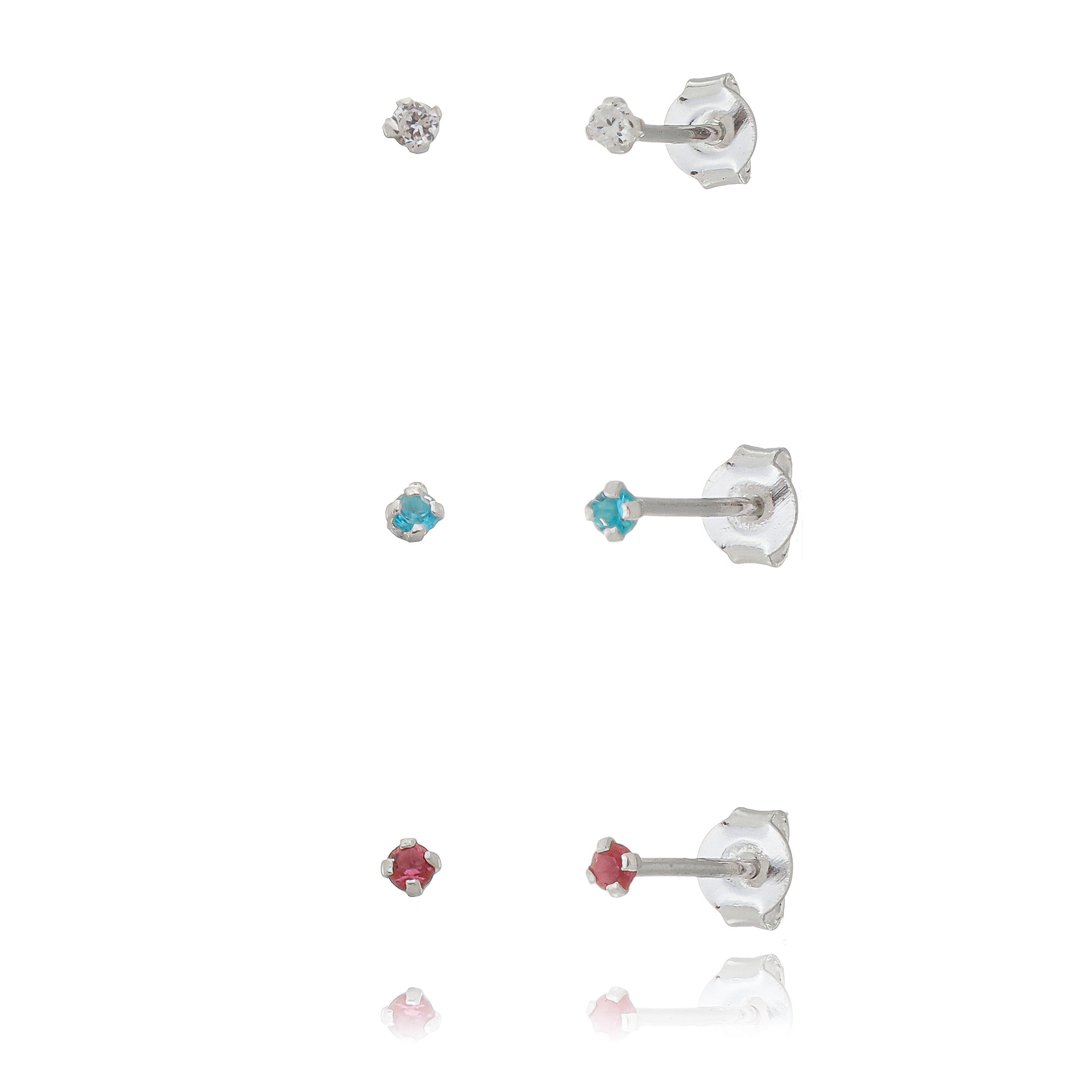 Trios de brincos zircônia 2mm - Cristal/Fúcsia/Azul Céu- Prata 925 (Contém 5 Trios)