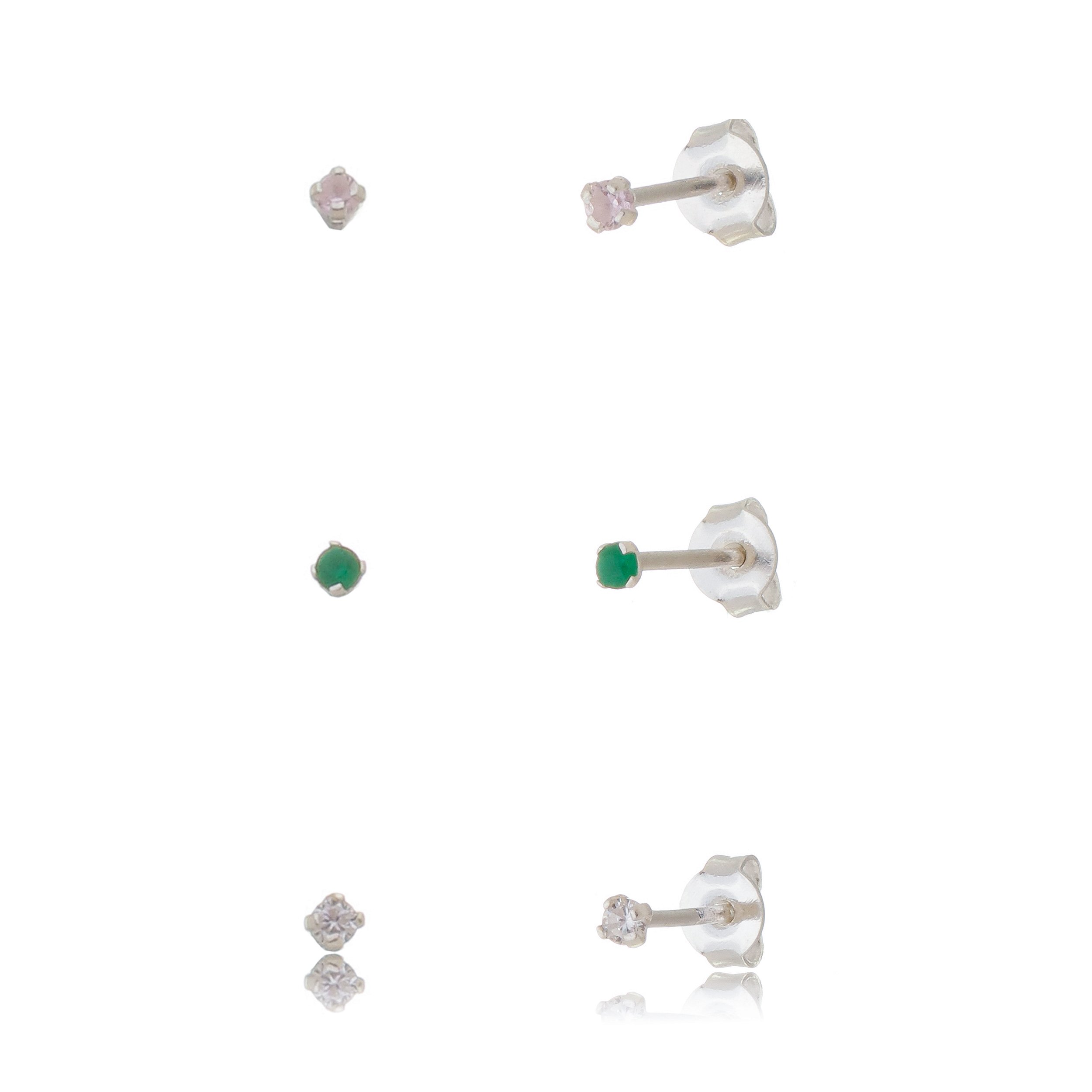 Trios de brincos zircônia 2mm - Cristal/Rosa/Verde- Prata 925 (Contém 5 Trios)
