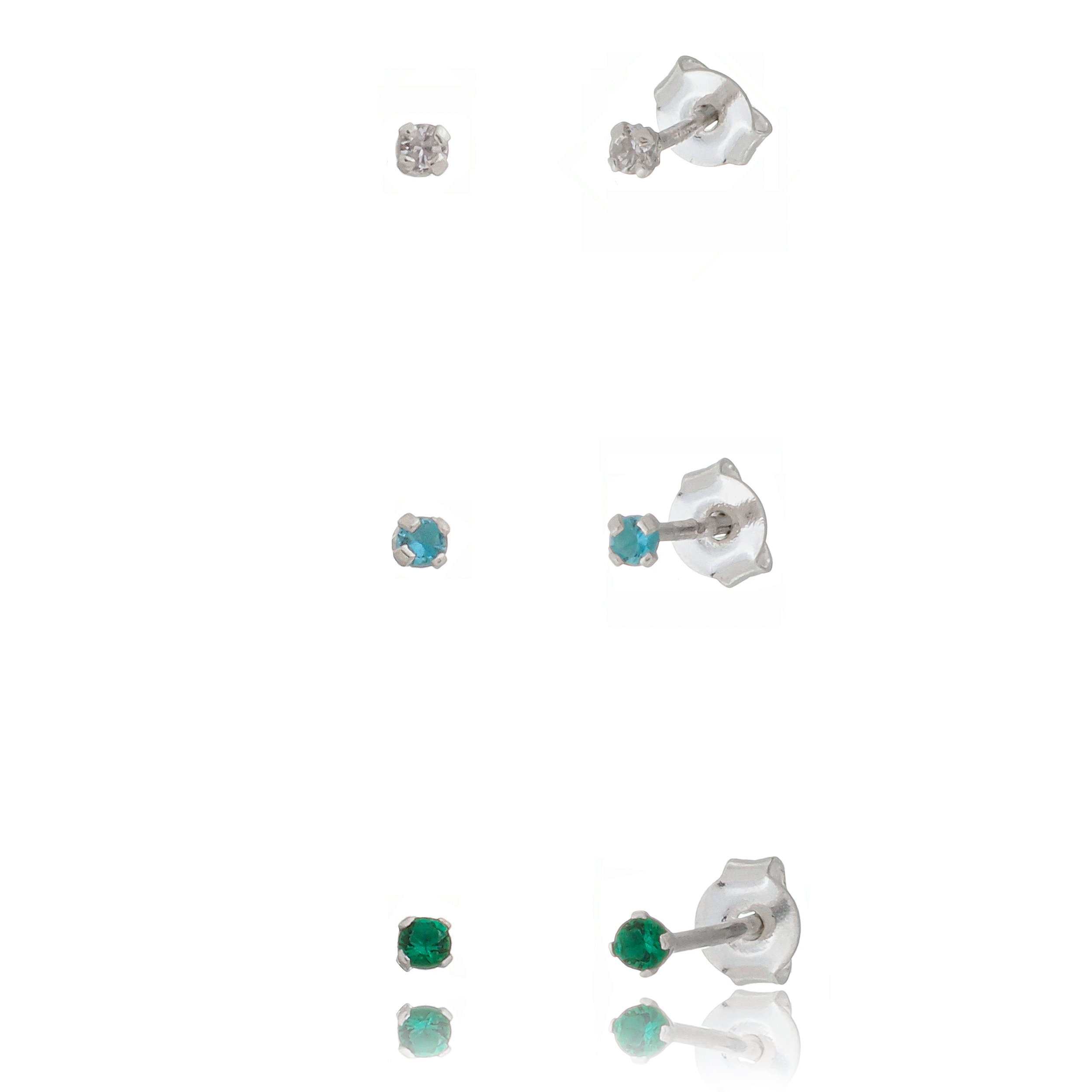Trios de brincos zircônia 2mm - Cristal/Azul/Verde- Prata 925 (Contém 5 Trios)