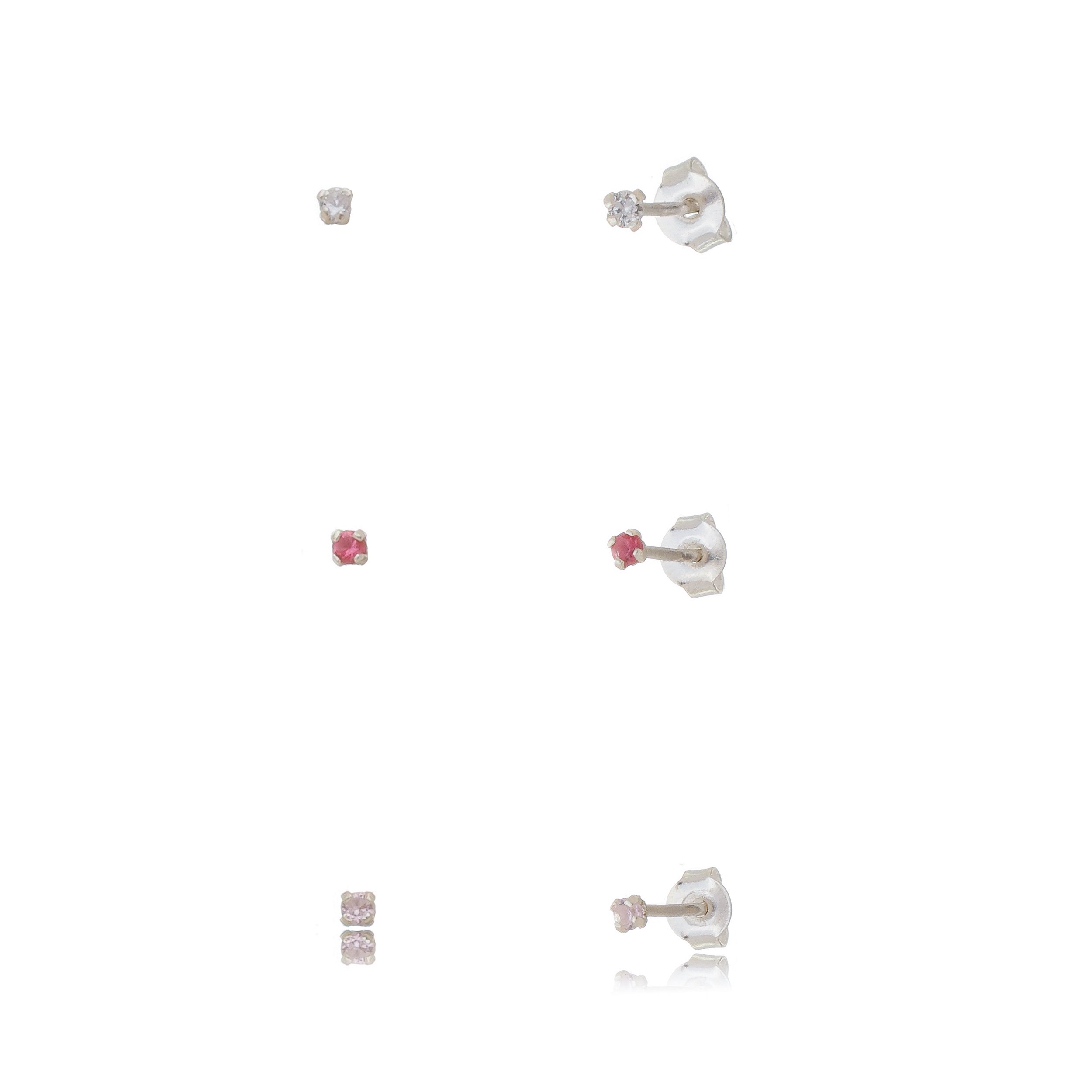 Trios de brincos zircônia 2mm - Rosa/Cereja/Cristal- Prata 925 (Contém 5 Trios)