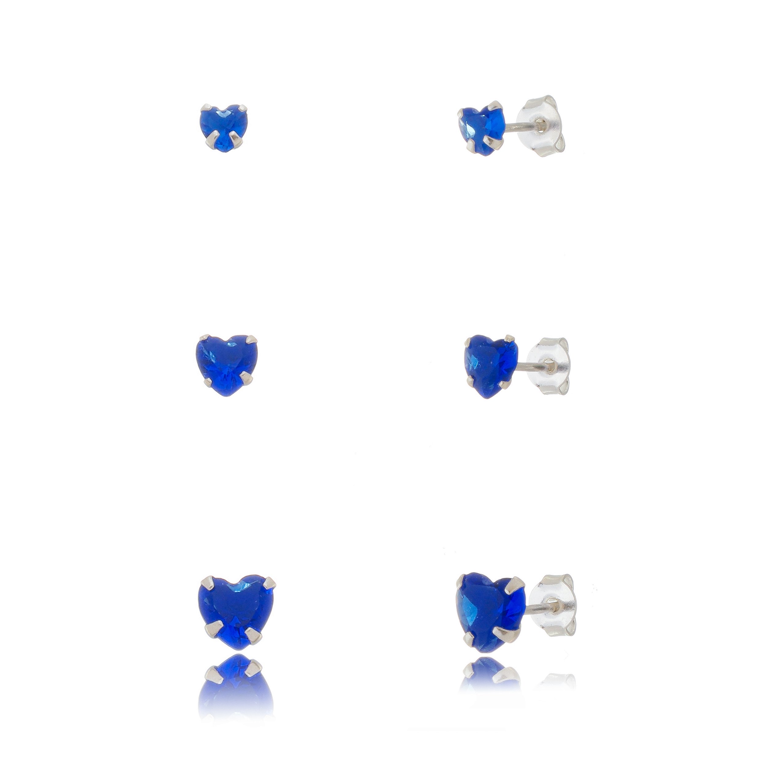 Trios de brincos zircônia Coração 4/5/6x6 - Azul Caneta - Prata 925 (Contém 5 Trios)