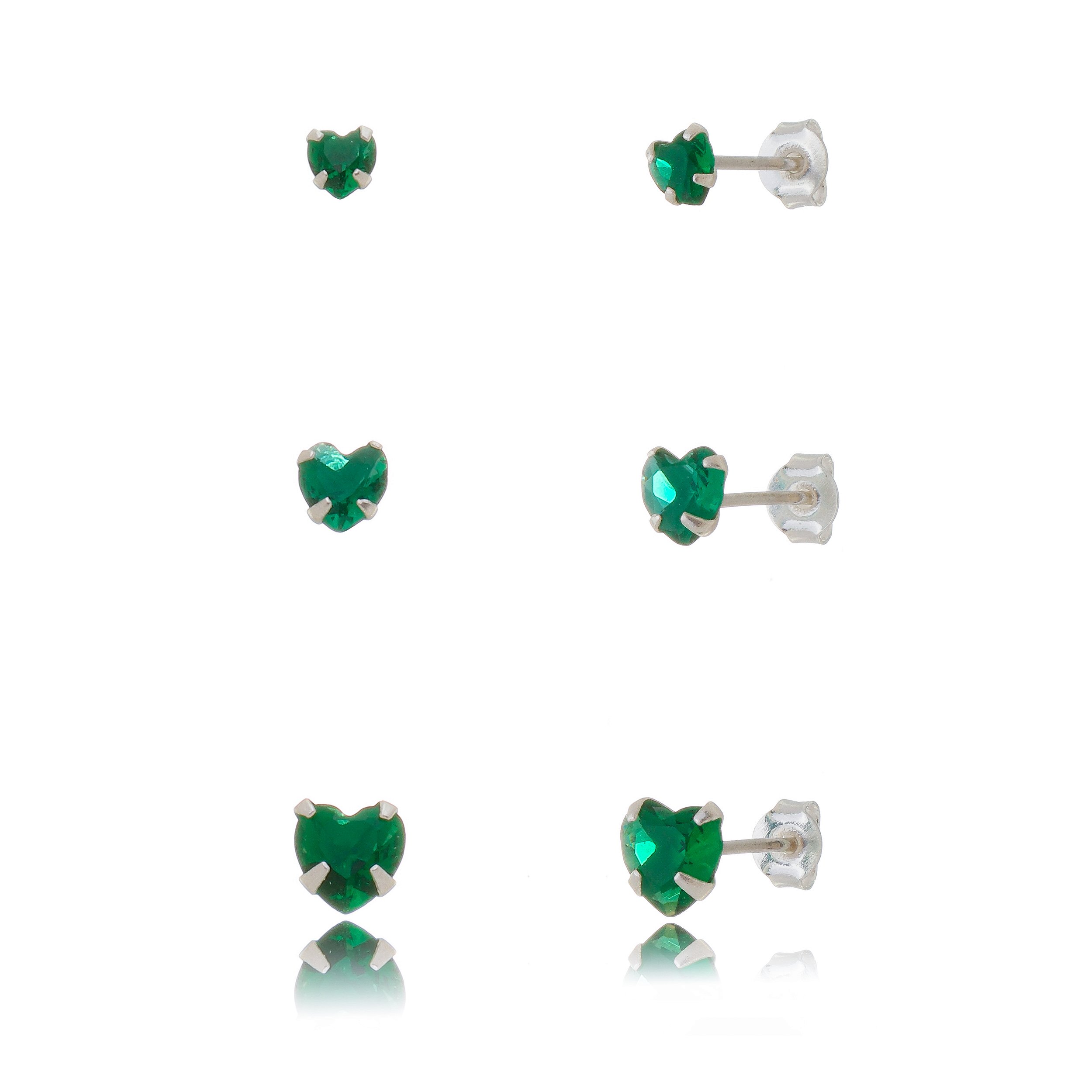 Trios de brincos zircônia Coração 4/5/6x6 - Verde Esmeralda - Prata 925 (Contém 5 Trios)