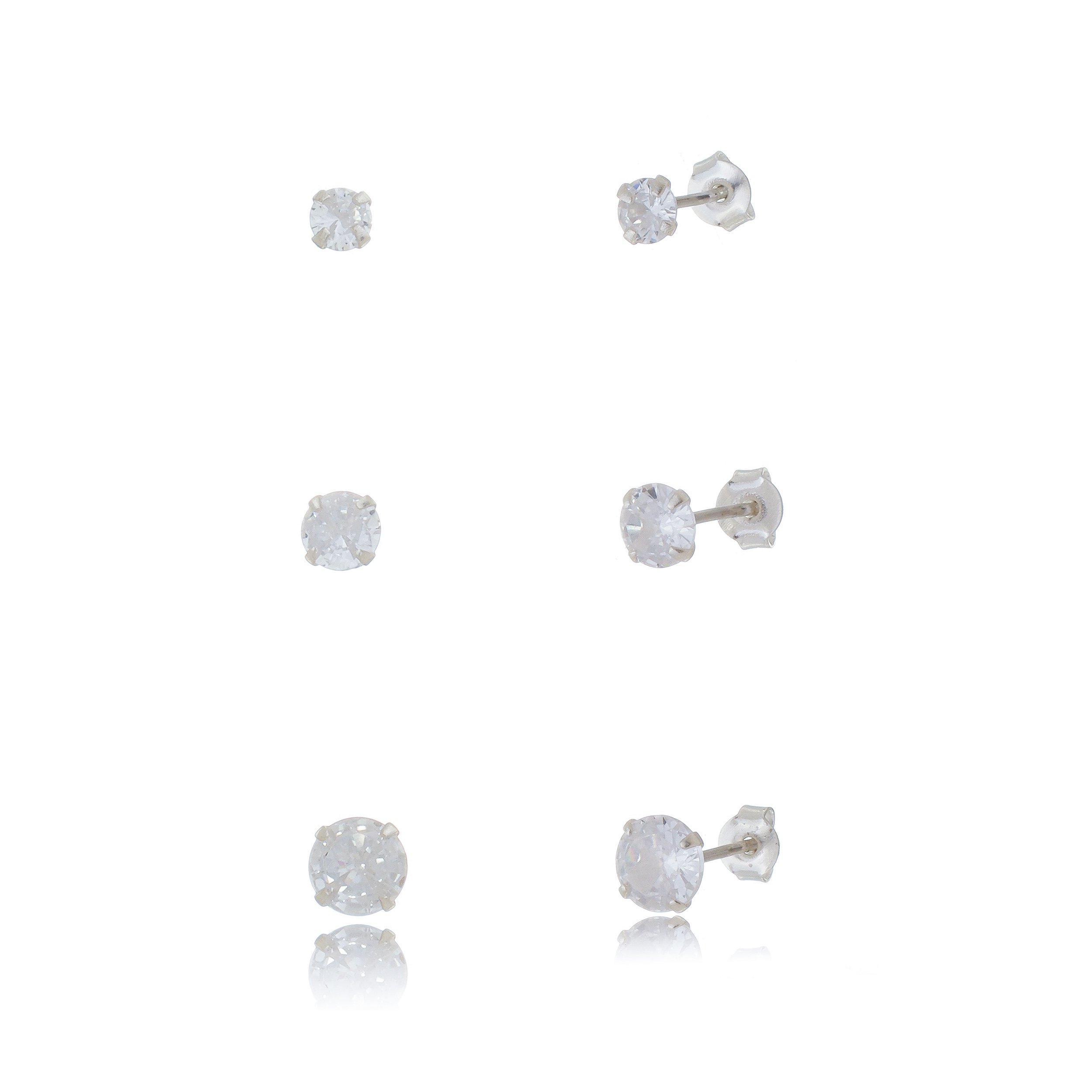 Trios de brincos zircônia Redondo - Cristal 3/4/5mm - Prata 925 (Contém 5 Trios)